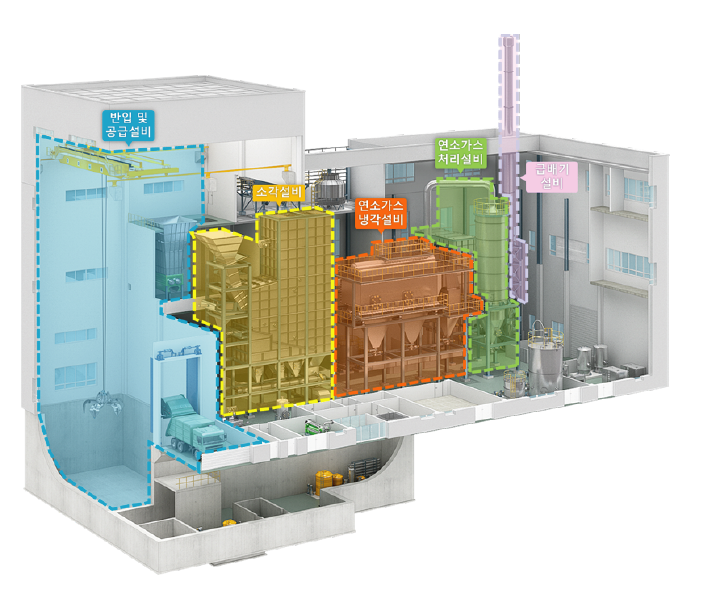 내부에서 분사한 소석회슬러리가 배기가스 내의 황산화물과 염산가스를 흡수, 흡착시켜 배기가스 중 산성물질을 90% 이상 제거하는 반건식 반응탑과 소석회 분말, 활성탄을 이용해 잔여 산성가스 및 다이옥신을 제거하고 백필터를 통해 미세먼지를 99%이상 제거하는 여과집진기 등을 설치하여 최적의 대기오염 방지설계
